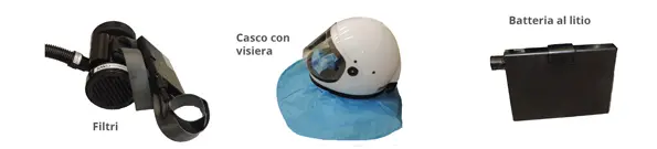 L’elettrorespiratore è composto da:L’elettrorespiratore è composto da:– un casco con visiera fissa e indicatore di portata integrato,– una centralina,– una batteria al litio,– un caricabatteria,– due filtri,– una cintura,– una tubo di respirazione,– un cavo elettrico.